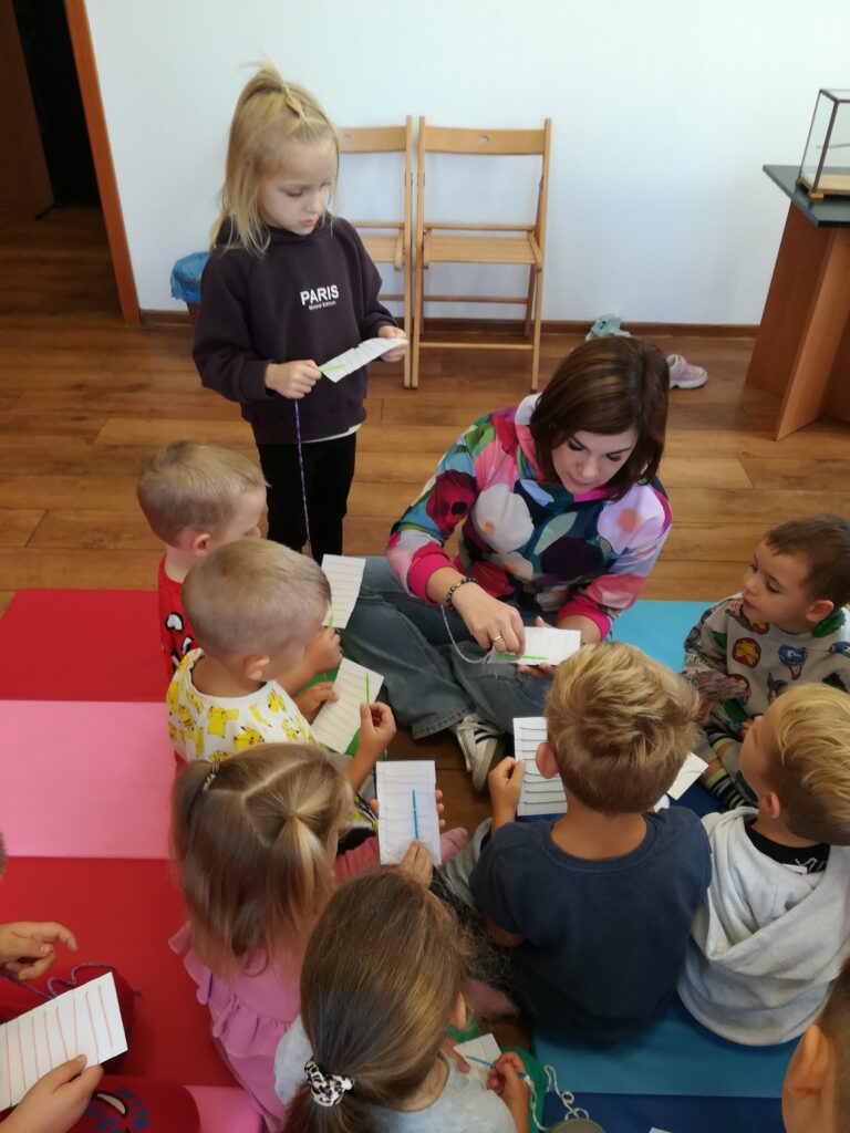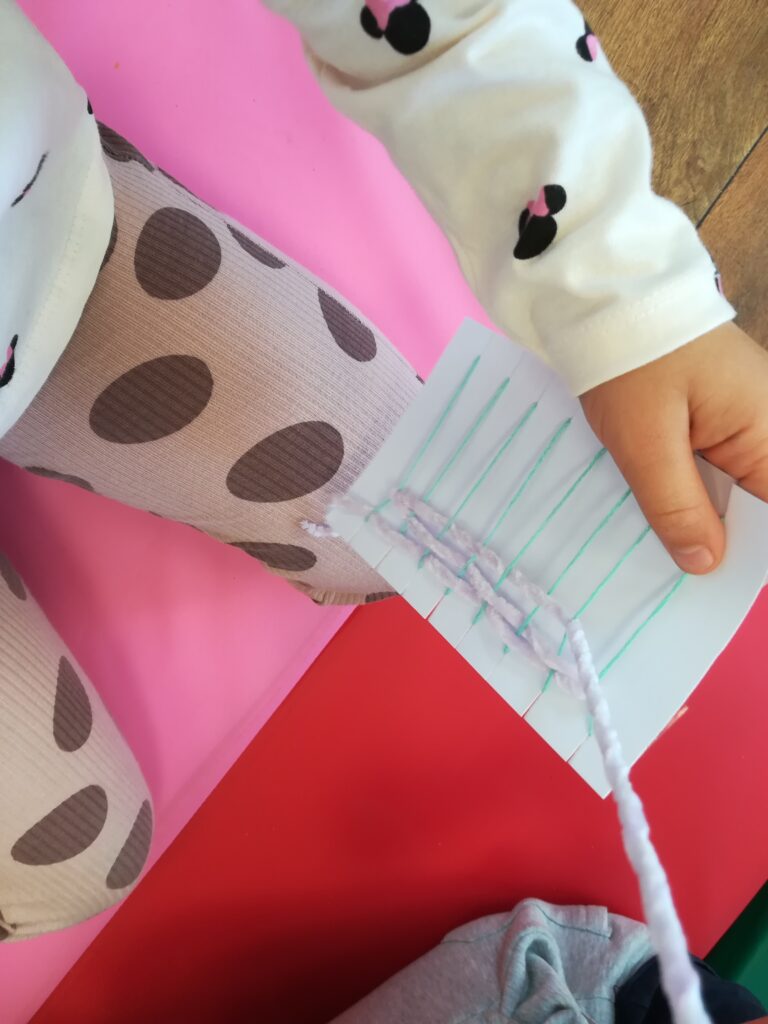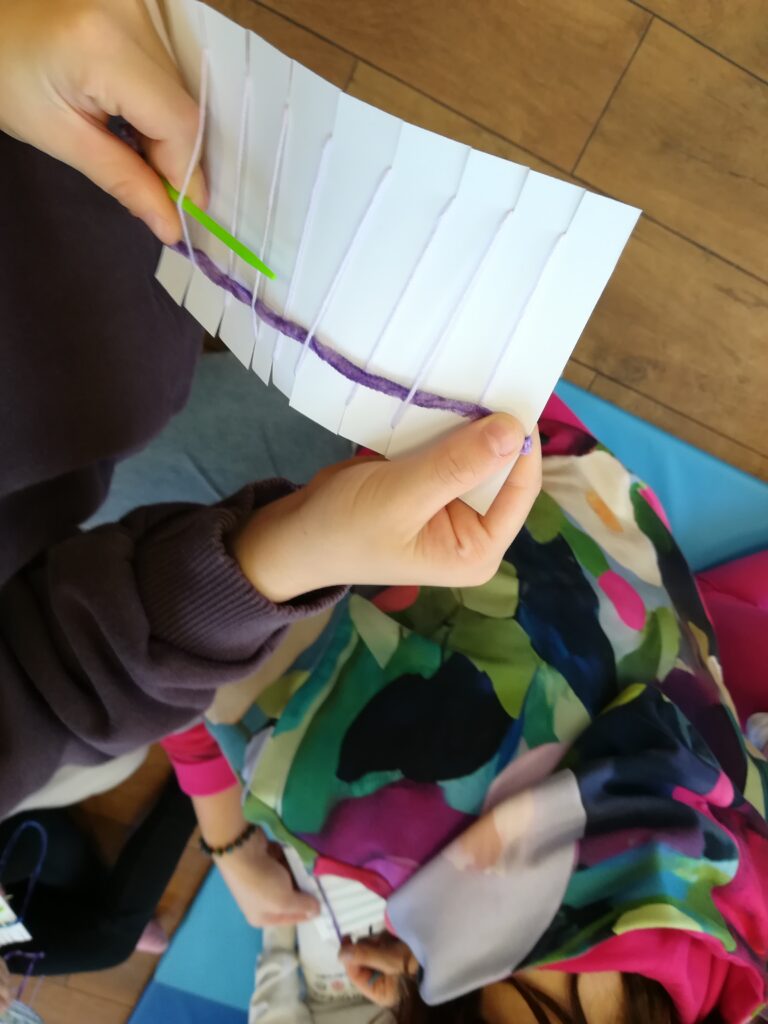 Przedszkolaki miały okazję zapoznać się z historią lokalnego przemysłu włókienniczego i po raz pierwszy zobaczyć: zabytkowy kołowrotek, gałązkę bawełny – naturalny surowiec do produkcji tkanin, dawne czółenka tkackie oraz rycinę przedstawiającą XIX-wieczne krosno. Następnie samodzielnie przeplatały kolorowe włóczki na mini-ramkach tkackich i tworzyły własne barwne plecionki.