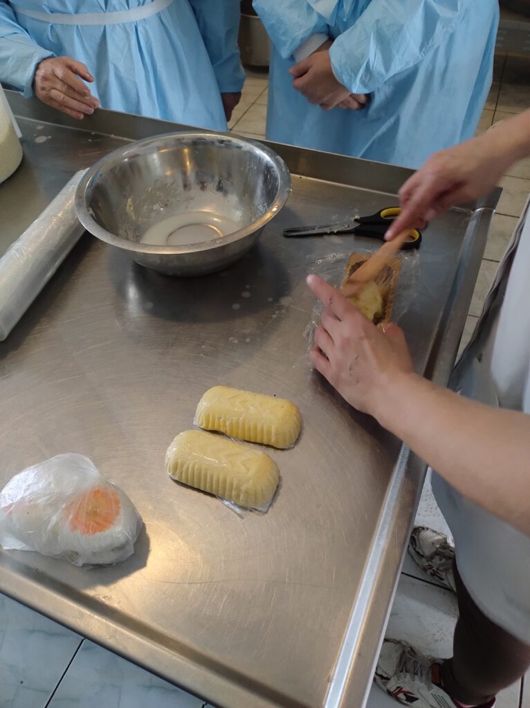 Przechadzka po dawnych zabudowaniach dworskich Zagrody Pasternak pozwoliła nam na chwilę zatrzymać się i zastanowić nad historią miejsca oraz ludzi, którzy tu żyli. Architektura i sposób funkcjonowania gospodarstwa przypomniały nam, że tradycja to nie tylko receptury, ale także sposób myślenia o otaczającej nas rzeczywistości — o jej porządku, szacunku do natury i planowaniu, które owocuje zrównoważonym rozwojem. Kolejną atrakcją była wizyta u zwierząt hodowlanych podczas której  poznaliśmy stado bardzo spokojnych byków i przeuroczą kozę Klarę. Po zwiedzaniu czekały już na nas warsztaty z własnoręcznej produkcji masła i sera. Prowadzący warsztaty krok po kroku pokazali, jak z krowiego mleka wyczarować świeże masło. Seniorzy z radością mieszali, ubijali i smakowali, a ich doświadczenie w pracy z produktami mlecznymi okazało się niezwykle cenne – potwierdzili, że w dawnych czasach na wsi nic nie marnowano i każdy etap produkcji miał swoje miejsce i sens. Kiedy masło było już na stole, przyszła pora na serowy rytuał. Produkcja sera wymagała od nas cierpliwości i precyzji: od zsiadłego mleka po zarysowanie skrzepu: seniorzy bardzo dokładnie  mieszali podpuszczkę, kroili skrzep i odprowadzali serową masę do form.