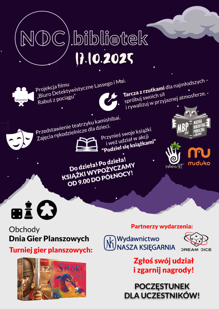Wydarzenie współtworzymy z naszymi partnerami: Wydawnictwem Nasza Księgarnia, Dream Dice oraz Muduko – dziękujemy za wsparcie i nagrody. Po szczegóły zaglądajcie na mbp.bielawa.pl i na nasze profile. Do zobaczenia w bibliotece – 17 października 2025 r.