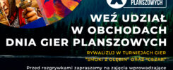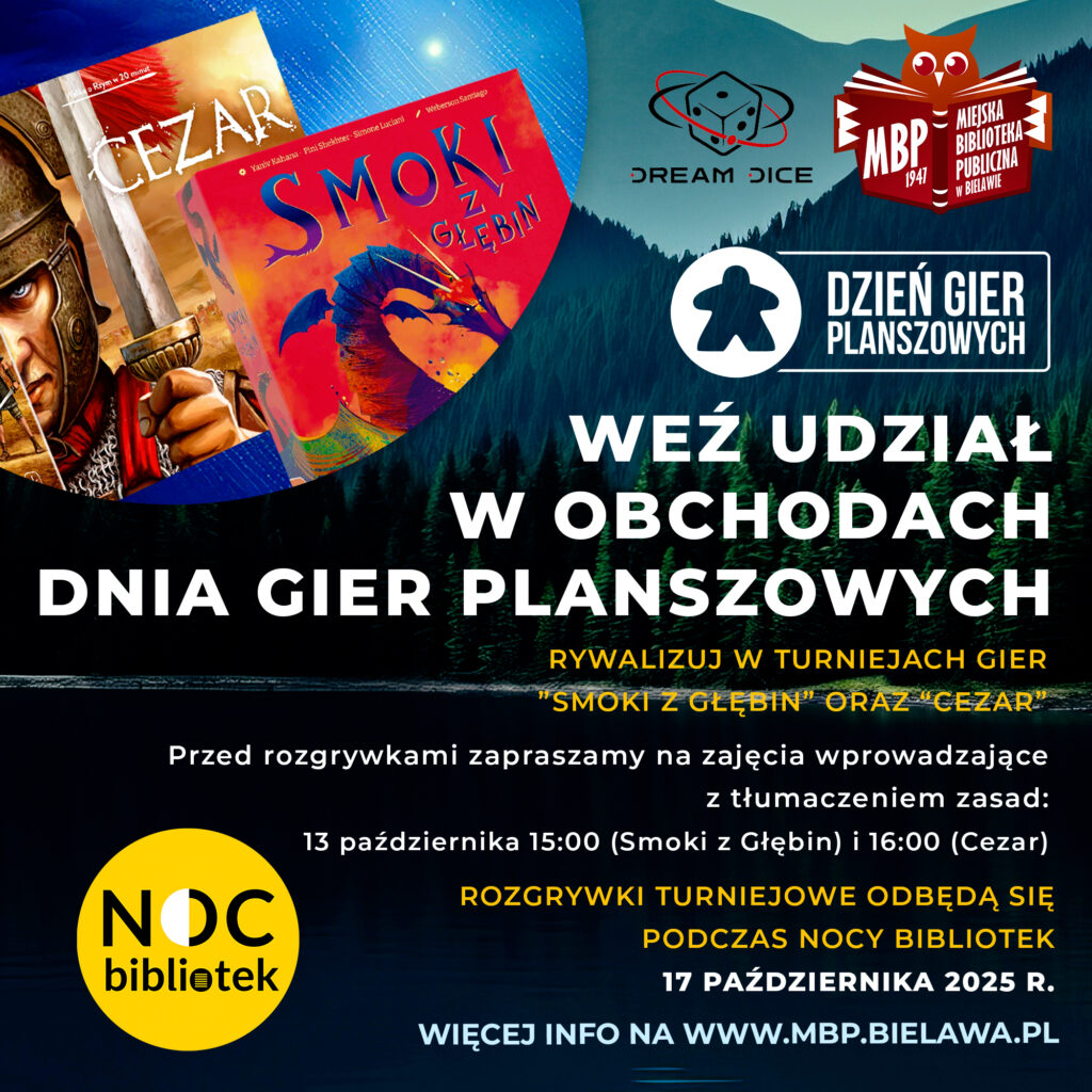 W tym roku, podobnie jak w poprzednich latach, Noc Bibliotek łączymy z Obchodami Dnia Gier Planszowych. W programie turnieje dwóch hitów: „Smoki z Głębin” i „Cezar” – nagrody już na Was czekają. Dla tych, którzy chcą wejść w rozgrywki bez stresu, przygotowaliśmy zajęcia wprowadzające z tłumaczeniem zasad: 13 października o 15:00 („Smoki z Głębin”) i o 16:00 („Cezar”). Liczba miejsc w turniejach jest ograniczona, dlatego zgłoście swój udział jak najszybciej – gwarantujemy dobrą zabawę, sportowe emocje i upominki dla najlepszych.